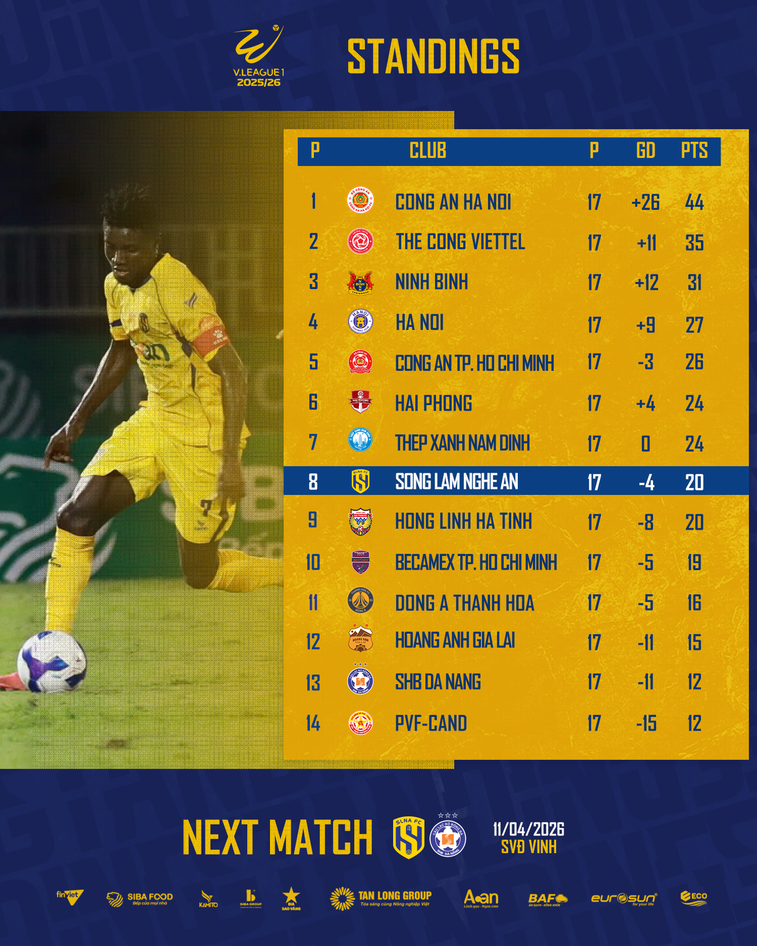Ở vòng đấu tiếp theo, Sông Lam Nghệ An sẽ tiếp đón SHB Đà Nẵng trên sân nhà. Đây được xem là trận đấu mang tính chất “6 điểm” trong cuộc đua trụ hạng, nơi thầy trò HLV Văn Sỹ Sơn cần tận dụng tối đa lợi thế sân nhà để hướng tới mục tiêu an toàn ở mùa giải năm nay.